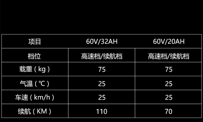 (注:續(xù)航里程因電量、氣溫、路況、載重和駕駛習(xí)慣不同會(huì)有較大差異 上述續(xù)航數(shù)據(jù)為采用60V/32Ah電池,騎行者體重75kg,25km/h勻速行駛,環(huán)境溫度25℃)